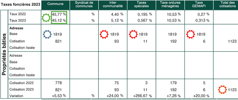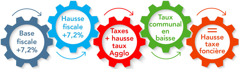La base fiscale (valeur locative) actuellement et progressivement en refonte est fixée par les services fiscaux et transmise (a posteriori) à la commune. En 2023, l'État a décidé d'une évolution de +7,2% de la base, ce qui entraîne une augmentation mécanique de 7,2% de la fiscalité.